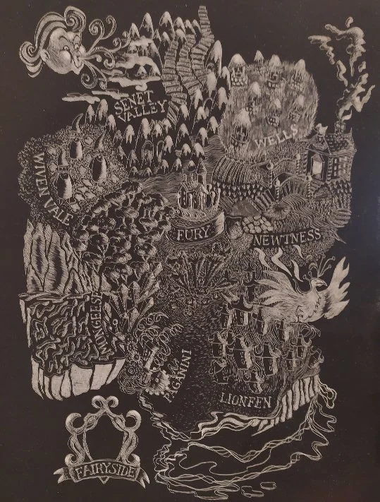 To celebrate my shortlisting, my good friends Andi Spark and her partner Paul Cleveland presented me with this beautiful map of Fairyside. Andi designed the illustration and Paul etched the design onto scratchboard.